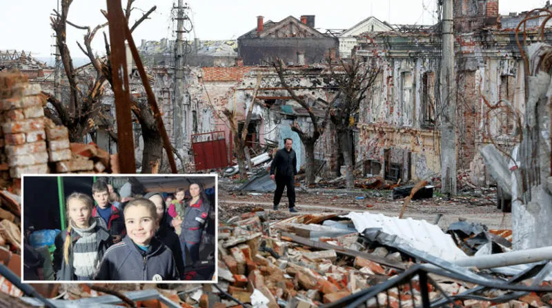 أوكراني يمشي وسط الدمار جراء القصف الروسي في ماريوبول أمس... وفي الإطار أطفال في ملجأ بمجمع الصلب في المدينة (رويترز)
