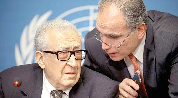 الإبراهيمي يصغي إلى مساعده خلال مؤتمر صحافي عقده في جنيف أمس (أ.ب)