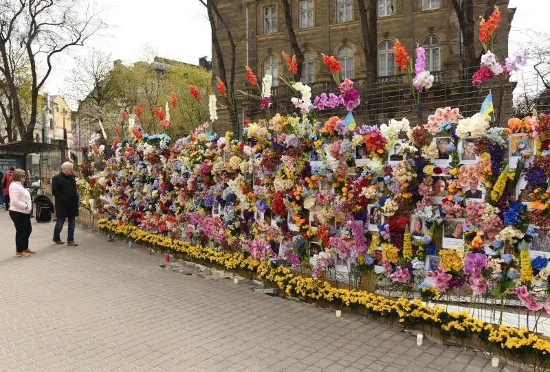 في مدينة لفيف الواقعة غرب أوكرانيا، توقفت تيتيانا كاسيان على الرصيف لتتأمل جداراً من الزهور أقيم بين ليلة وضحاها تخليداً لذكرى قتلى الحرب الروسية في البلاد.