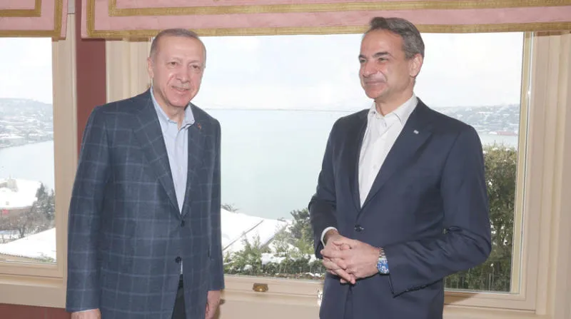 الرئيس التركي مع رئيس الوزراء اليوناني خلال اجتماعهما في إسطنبول الشهر الماضي (أ.ب)