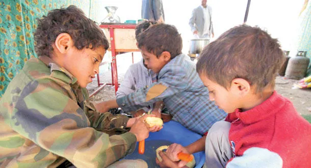 أطفال يمنيون نازحون يعدون الطعام في مدرسة بصنعاء (رويترز)