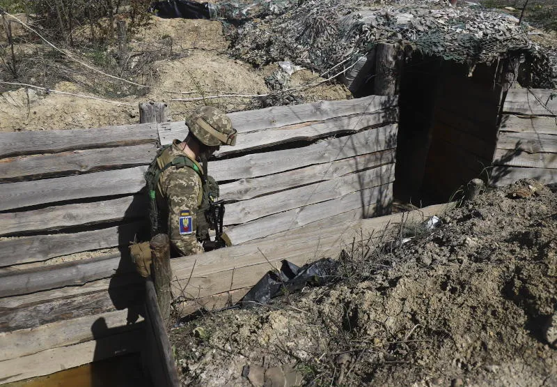 جندي أوكراني يسير في موقعه بالقرب من مدينة بوباسنا (إ.ب.أ)