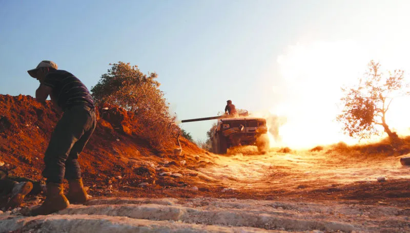 مقاتل من «لواء الفرقان» يسد أذنيه بعد إطلاق قذيفة على قوات الأسد في مواجهات للسيطرة على معسكر المسطومة أمس (رويترز)