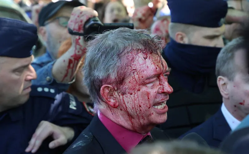 السفير الروسي لدى بولندا بعد رشه بمادة حمراء أول من أمس (رويترز)