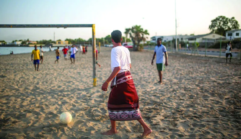 لاجئون يمنيون يلعبون كرة قدم في جيبوتي أمس (أ.ب)