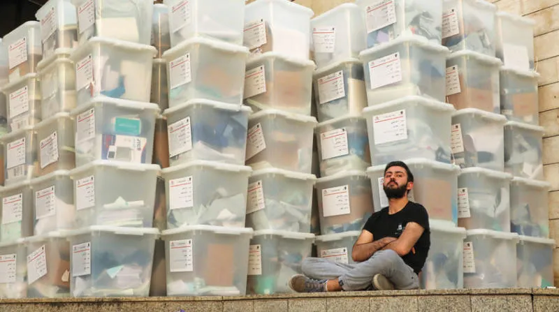 موظف لبناني يستريح قرب مجموعة كبيرة من صناديق الاقتراع (رويترز)