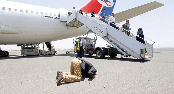 يمني يسجد شاكرا بعد وصوله مع مجموعة مكونة من 200 يمني كانوا عالقين في مصر إلى مطار صنعاء الدولي أمس (إ.ب.أ)