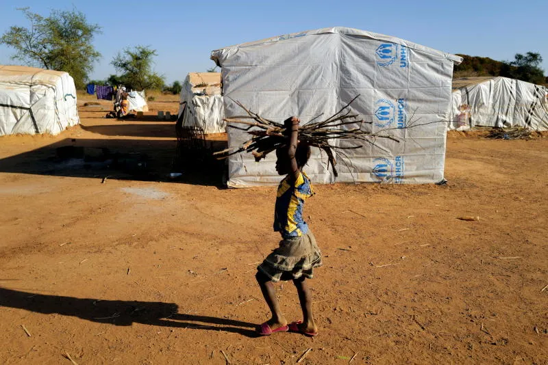 فتاة صغيرة تحمل حطباً في مخيم للنازحين في بوركينا فاسو (رويترز)