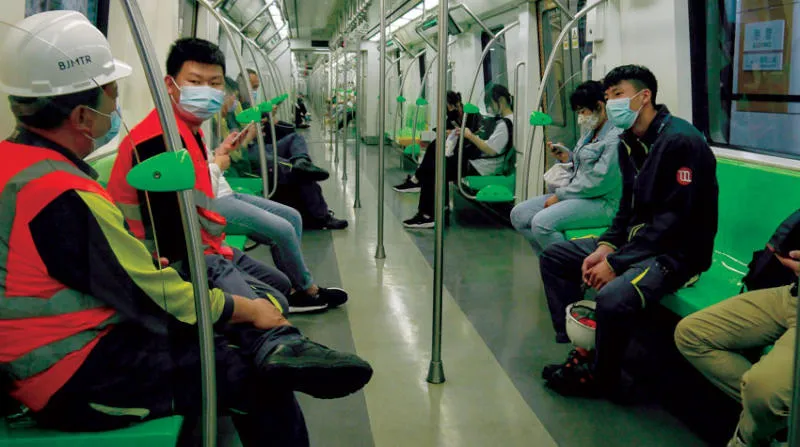 عمال يرتدون كمامات في مترو انفاق بكين أمس (إ.ب.أ)