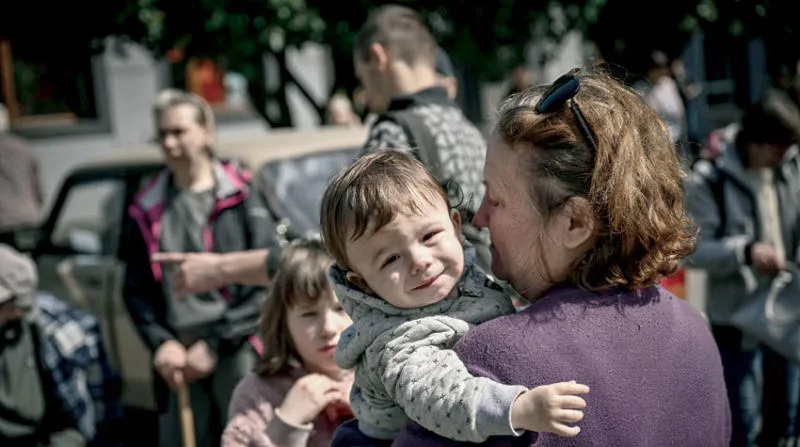 سكان يغادرون مدينة باخموت الواقعة في دونباس بالشرق الأوكراني أمس (أ.ف.ب)