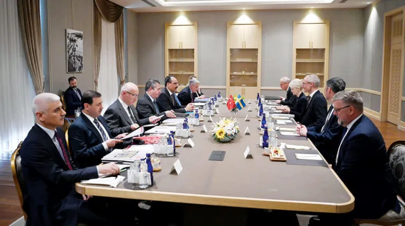الفريقان؛ التركي (يسار) والسويدي خلال اجتماعهما في أنقرة أمس (أ.ف.ب)
