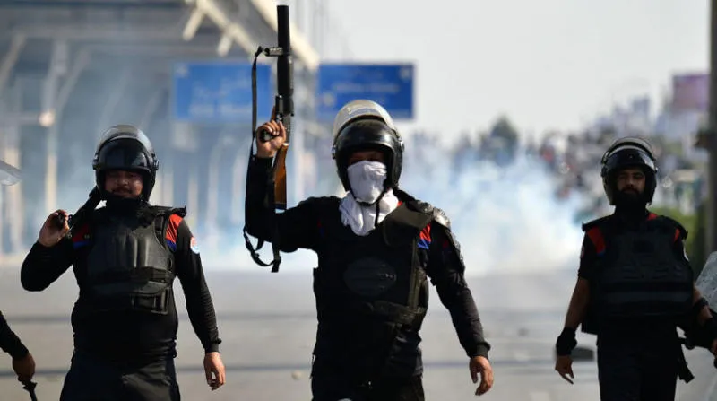 رجال شرطة باكستانيون بعد إطلاق قذائف الغاز المسيل للدموع على أنصار رئيس الوزراء الباكستاني السابق عمران خان خلال مسيرة احتجاجية في روالبندي اول من أمس " ا ف ب "
