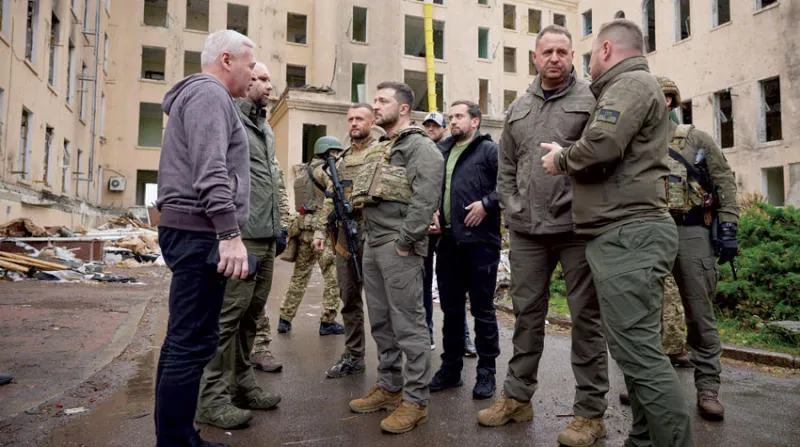 وخلال أول زيارة له خارج كييف، ظهر زيلينسكي يتفقد الدمار، وأثنى على جنود أوكرانيين قائلاً: «إنكم تخاطرون بحياتكم من أجلنا جميعاً ومن أجل بلادنا»، حسبما أفاد مكتب الرئيس. وكتب زيلينسكي في منشور بمناسبة الزيارة: «هناك 2229 منزلاً مدمراً في خاركيف وفي المنطقة. سنرمم وسنعيد الإعمار وسنعيد الحياة، إلى خاركيف والمدن والقرى الأخرى كافة».