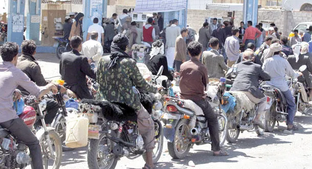 سائقو دراجات نارية يصطفون في انتظار دورهم للتزود بالوقود في صنعاء أمس (إ.ب.أ)
