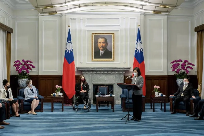رئيسة تايوان تساي إنغ وين (وسط) تتحدث إلى السيناتور الأميركي تامي داكويرث داخل المكتب الرئاسي في تايبيه (إ.ب.أ)