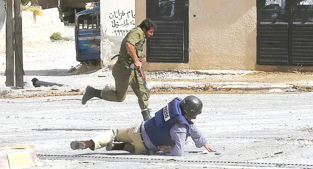 صحافي من وكالة الصحافة الفرنسية (على الأرض) وجندي سوري أثناء فرارهما من اشتباكات في معلولا أمس (أ.ف.ب)