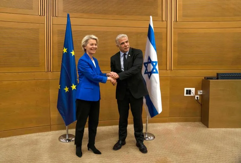 رئيسة المفوضية الأوروبية أورسولا فون دير لايين خلال لقائها وزير الخارجية الإسرائيلي يائير لبيد (أ.ف.ب)