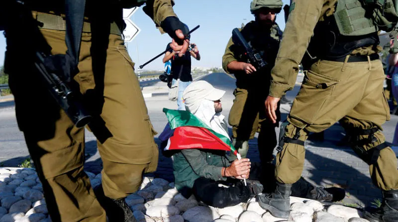 جنود يعتقلون نشطاء سلام حاولوا منع المستوطنين من نزع أعلام فلسطين في قرية عزون (إ.ب.أ)