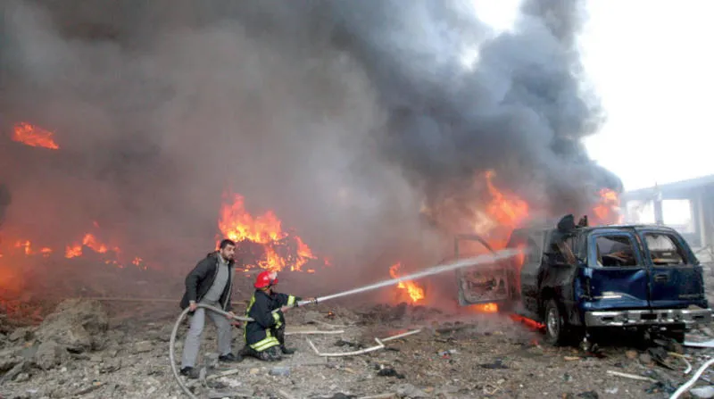 من الحريق الذي اندلع في موقع الانفجار الذي أودى بحياة رفيق الحريري و22 آخرين في 2005 (أ.ب)