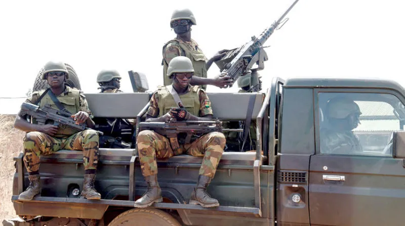 جنود توغو يقفون في حراسة أثناء قيامهم بدورية بشمال البلاد وتشتبه الحكومة أن المتطرفين المشتبه بهم قتلوا 8 جنود وجرحوا 13 آخرين قرب الحدود مع بوركينا فاسو في أول «هجوم إرهابي» مميت (أ.ف.ب)