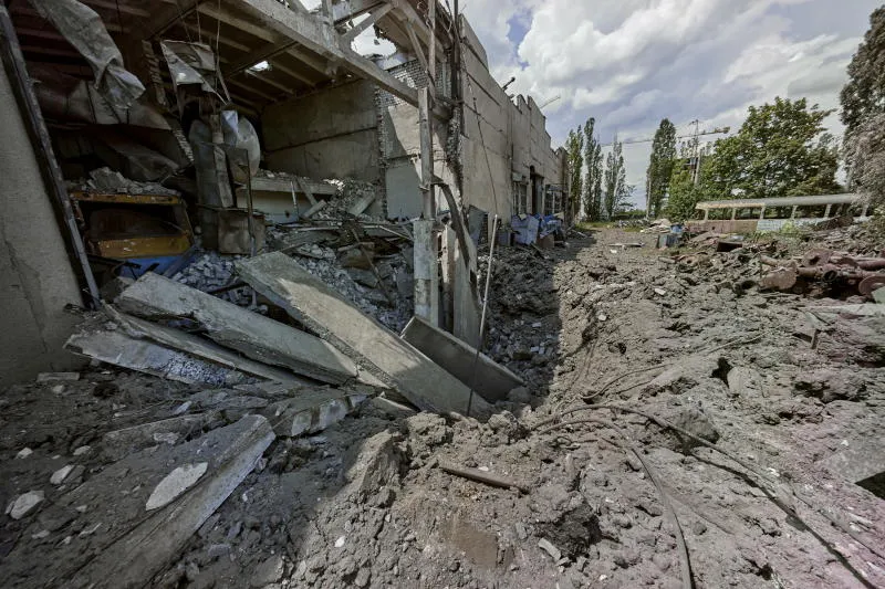 مستودع ترام مدمر بعد قصفه مؤخراً في خاركيف (إ.ب.أ)