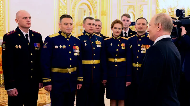 بوتين خلال لقائه خريجي الأكاديميات العسكرية في موسكو أمس (أ.ب)