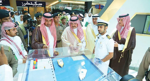الأمير مشعل بن ماجد بن عبد العزيز محافظ جدة يستمع لشرح خلال اطلاعه على نموذج مصغر في معرض المشاريع («الشرق الأوسط»)