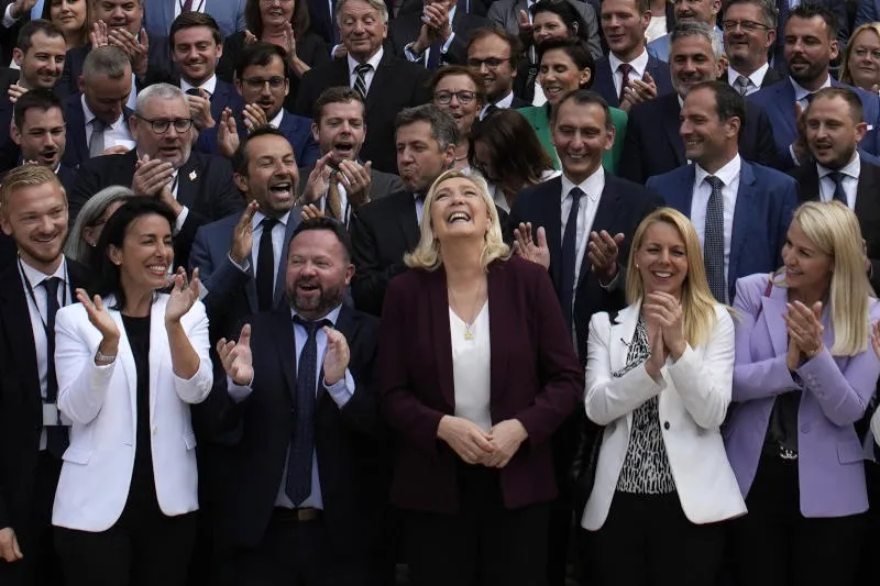 مارين لوبن تتوسط أعضاء كتلتها النيابية في الجمعية الوطنية (أ.ب.)