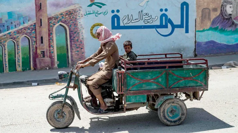 رجل وابنه يستقلان عربة في مدينة الرقة شمال سوريا في 19 يونيو الجاري (أ.ف.ب)