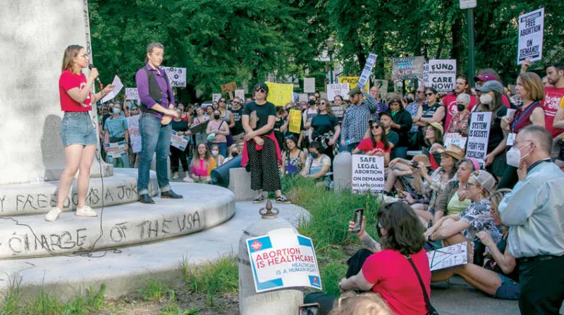 احتجاج ضد قرار المحكمة العليا حظر الإجهاض في بورتلاند أوريغون أول من أمس (أ.ف.ب)