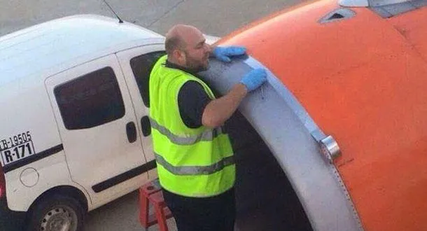 حالة من الصدمة انتابت راكبا على رحلة لخطوط طيران «إيزي جيت» حينما رأى أحد العمال بالمطار يلصق، بالمعنى الحرفي للكلمة، المحرك بشريط لاصق قبل لحظات من إقلاعها.