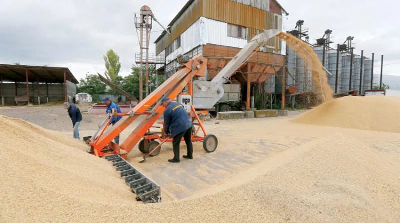 مزارعون أوكرانيون يخلطون حبوباً في مخزن بمنطقة أوديسا، في 23 يونيو (إ.ب.أ)