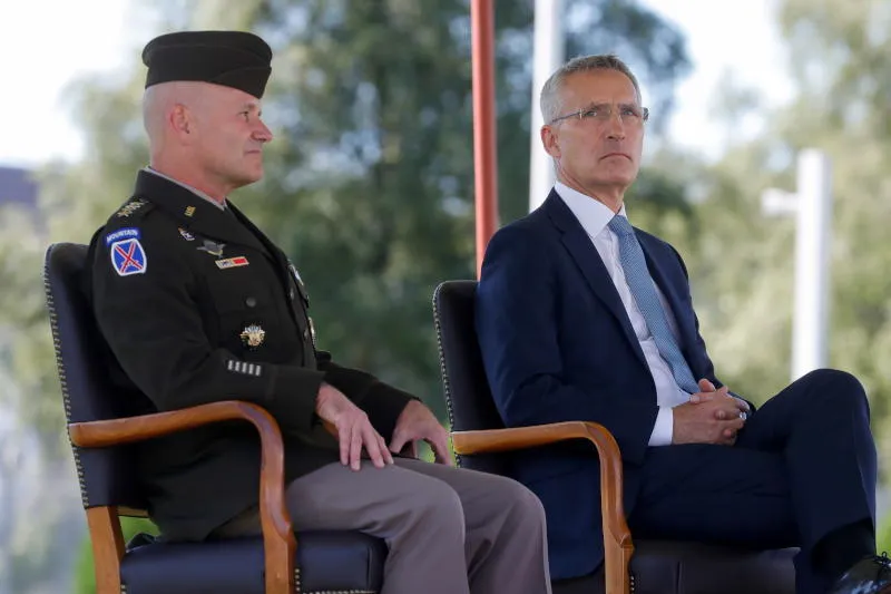 الأمين العام لحلف شمال الأطلسي ينس ستولتنبرغ والجنرال الأميركي كريستوفر كافولي (إ.ب.أ)