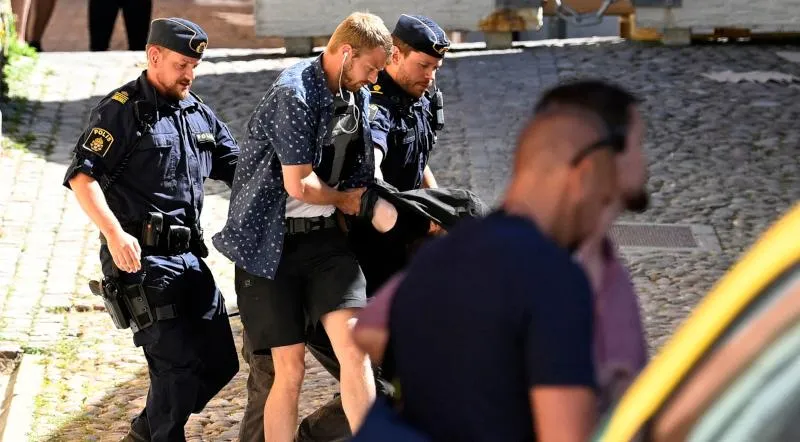 المشتبه في هجوم الطعن بجزيرة غوتلاند السويدية بعد اعتقاله (أ.ف.ب)