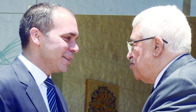 صورة وزعها مكتب الرئاسة الفلسطينية للرئيس عباس يصافح الأمير علي بن الحسين في أعقاب لقائهما أمس (أ.ف.ب)