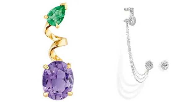 أقراط «روك أمازون» من «ميسيكا» من الماس، و أقراط مرصعة بالجمشت والزمرد من مجموعة «ديوراما بريسيوز» من «ديور»