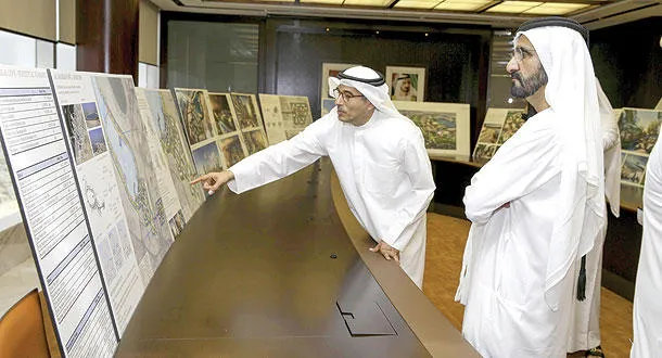 الشيخ محمد بن راشد يستمع لشرح محمد العبار عن مشروع خور الممزر («الشرق الأوسط»)