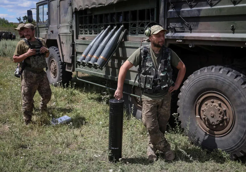 جنديان أوكرانيان يجهّزان قذائف مدفعية في منطقة دونباس (رويترز)