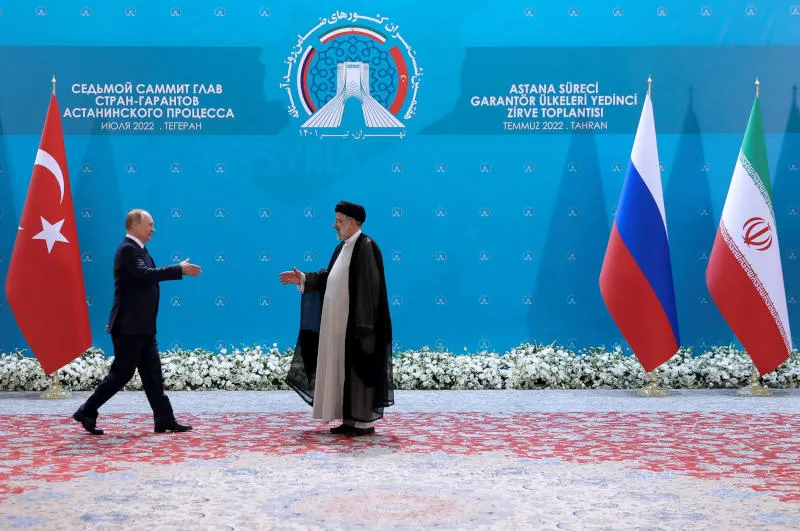 الرئيس الروسي فلاديمير بوتين مع نظيره الإيراني إبراهيم رئيسي في طهران (رويترز)