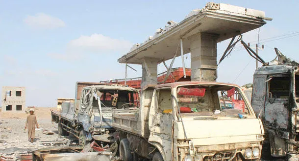 محطة وقود تابعة لقوات الحوثيين بعدما جرى استهدافها من قبل التحالف في إحدى الضواحي الشمالية بعدن أمس (أ.ف.ب)