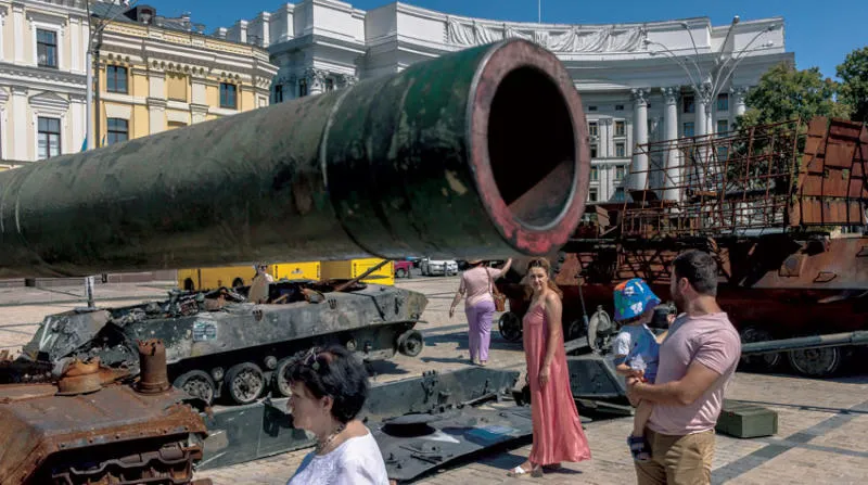 آليات عسكرية روسية مدمرة تعرض في كييف بمناسبة اليوم الوطني أمس (إ.ب.أ)