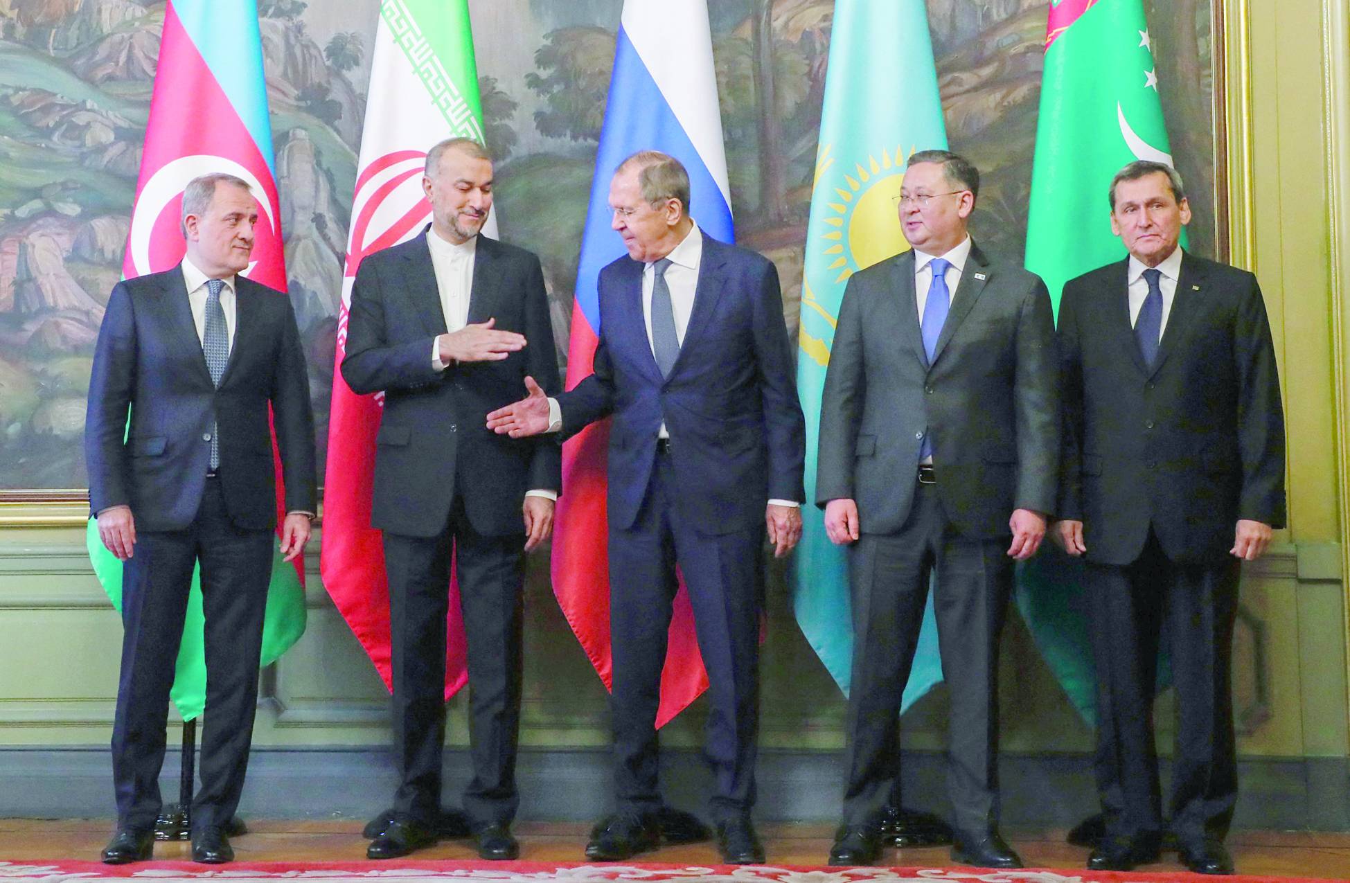 لافروف يصافح عبد اللهيان على هامش اجتماع سابق مع نظرائه في الدول الخمس المطلة على بحر قزوين بموسكو (أ.ف.ب)