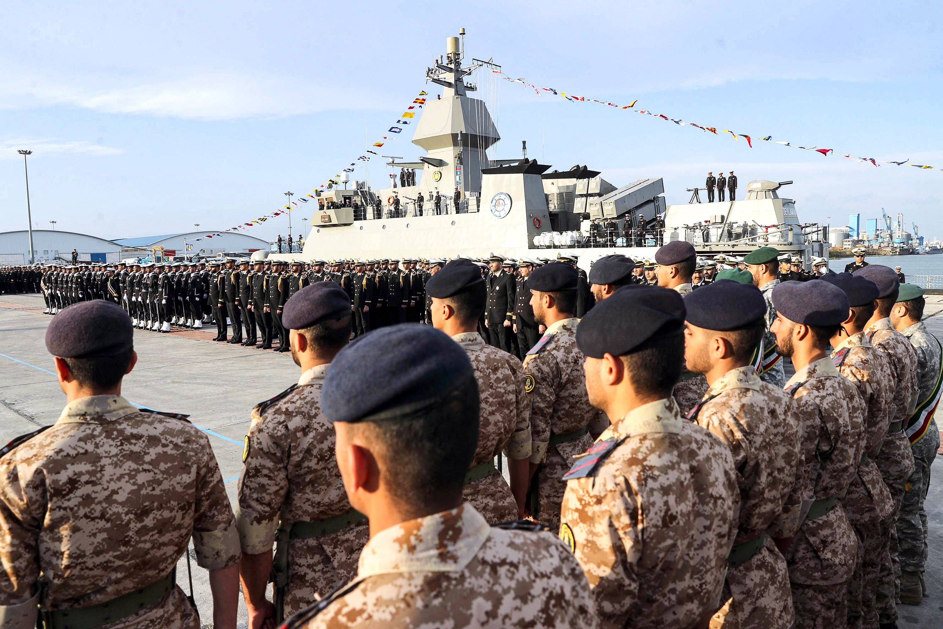 احتفال بتدشين السفينة الحربية الإيرانية الجديدة «ديلمان» في ميناء بندر أنزالي على بحر قزوين يوم الاثنين (مكتب الجيش الإيراني-أ.ف.ب)