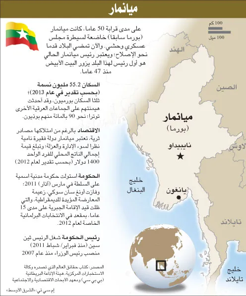 تعيش ميانمار حالة انتقال نوعية متسارعة نادرا ما يشهدها بلد بهذا الزخم، شغلت وسائل الإعلام خلال السنتين الأخيرتين، وشدت الغرب المتطلع لمد جسور معها على حساب الحليف الصيني التقليدي، بينما زادت مخاوف المسلمين من نسيان العالم معاناتهم في هذا البلد ذي الأغلبية البوذية. وزارت «الشرق الأوسط» ميانمار وجالت في عدد من مدنها والتقت ناشطين سياسيين ورجال دين وغيرهم لرصد هذا الانتقال التاريخي ومعرفة الآفاق المقبلة لهذا البلد الحيوي. وعبر حلقات تنشر يوميا، تبرز «الشرق الأوسط» أهم القضايا في البلاد. وتمر ميانمار بحالة انفتاح سياسي واقتصادي لافت، بعد أن كانت من أكثر الدول انغلاقا وتشابها لكوريا الشمالية في سياسات الحكام العسكريين الظالمة، إلا أن ظلال الماضي تلقي بثقلها على حالة الانفتاح هذه. فهناك عقبات كثيرة أمام ميانمار، مثل التحرر من أساليب قمعية لدولة انغلقت عن العالم لعقود طويلة، واقتصاد تشوبه مشاكل الفقر والتضخم، ولكن ربما العقبة الأبرز هي تحديد هوية الدولة. وهذه الهوية مرتبطة مباشرة باسم الدولة الرسمي الذي سيس على مدار العقود الماضية ليصبح مصدر خلاف في البلاد ليس فقط بسبب دلالاته السياسية بل بسبب ما تعنيه «بورما» للغالبية الإثنية في البلاد المعروفة باسم «البامار».