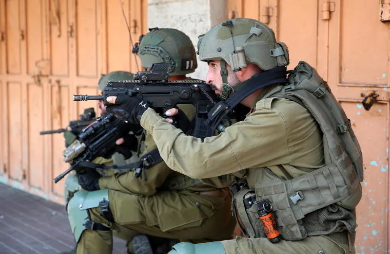 جنود إسرائيليون يصوبون أسلحتهم خلال اشتباكات في مدينة الخليل بالضفة الغربية المحتلة (إ.ب.أ)