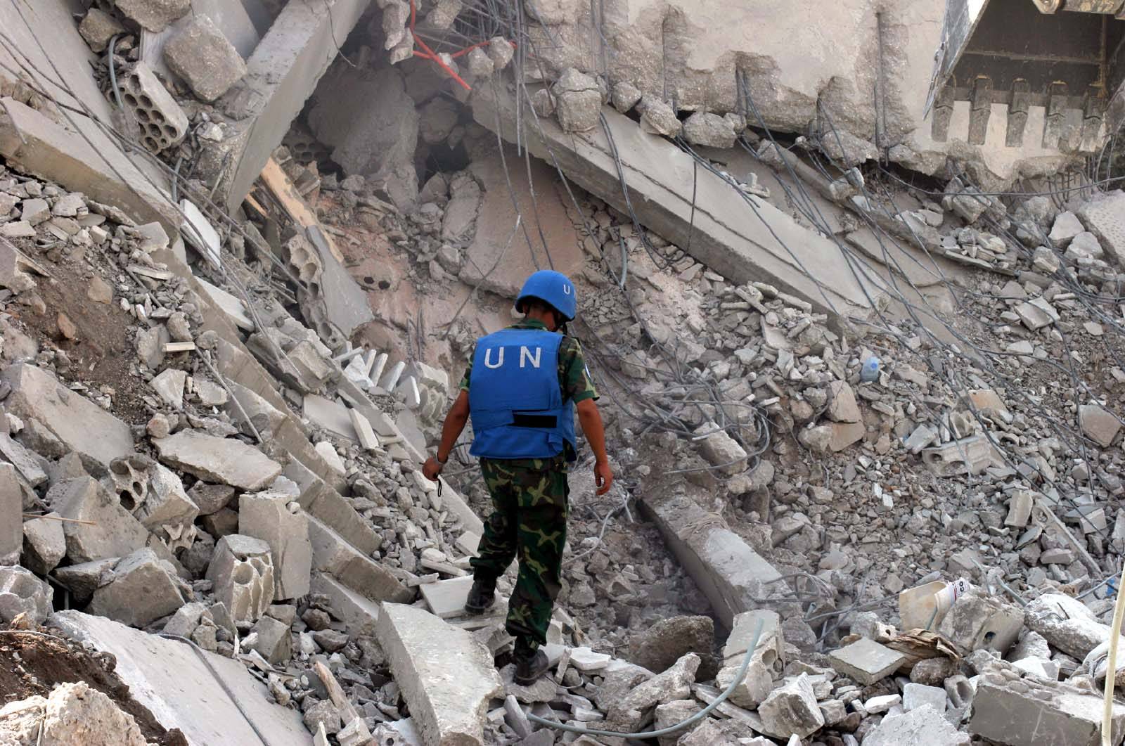 أحد عناصر الأمم المتحدة أمام أنقاض مبنى قصفته إسرائيل في قانا بجنوب لبنان (غيتي)