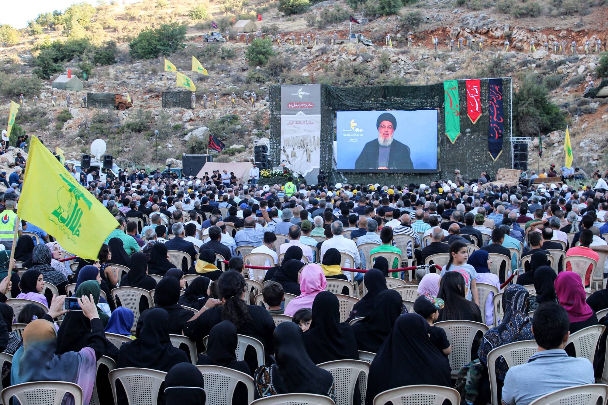 مؤيدون لـ «حزب الله» يستمعون إلى كلمة لزعيمه الراحل حسن نصر الله في قرية جنتا بشرق لبنان في 19 أغسطس 2022 (أ.ف.ب)