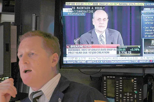 رد فعل متداول في بورصة نيويورك ليلة أول من أمس مع إعلان بن برنانكي رئيس الاحتياطي الأميركي على التلفزيون الإبقاء على خطة التحفيز النقدي (رويترز)