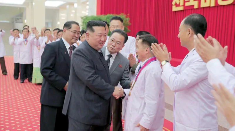 صورة وزعتها وكالة الأنباء الرسمية في بيونغ يانغ للزعيم الكوري الشمالي يصافح الأطباء الذين شاركوا في «الانتصار» على «كورونا» (إ.ب.أ)