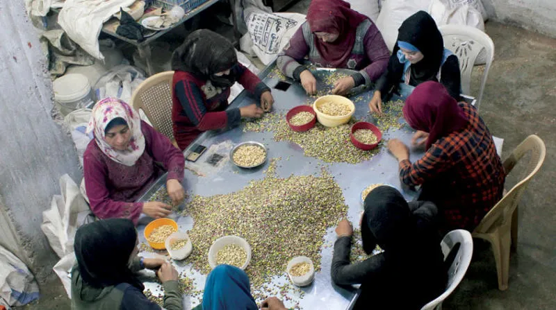 نسوة يعملن في فرز حبّات الفستق الحلبي في مصنع بمدينة مورك في ريف حماة وسط سوريا أمس (رويترز)